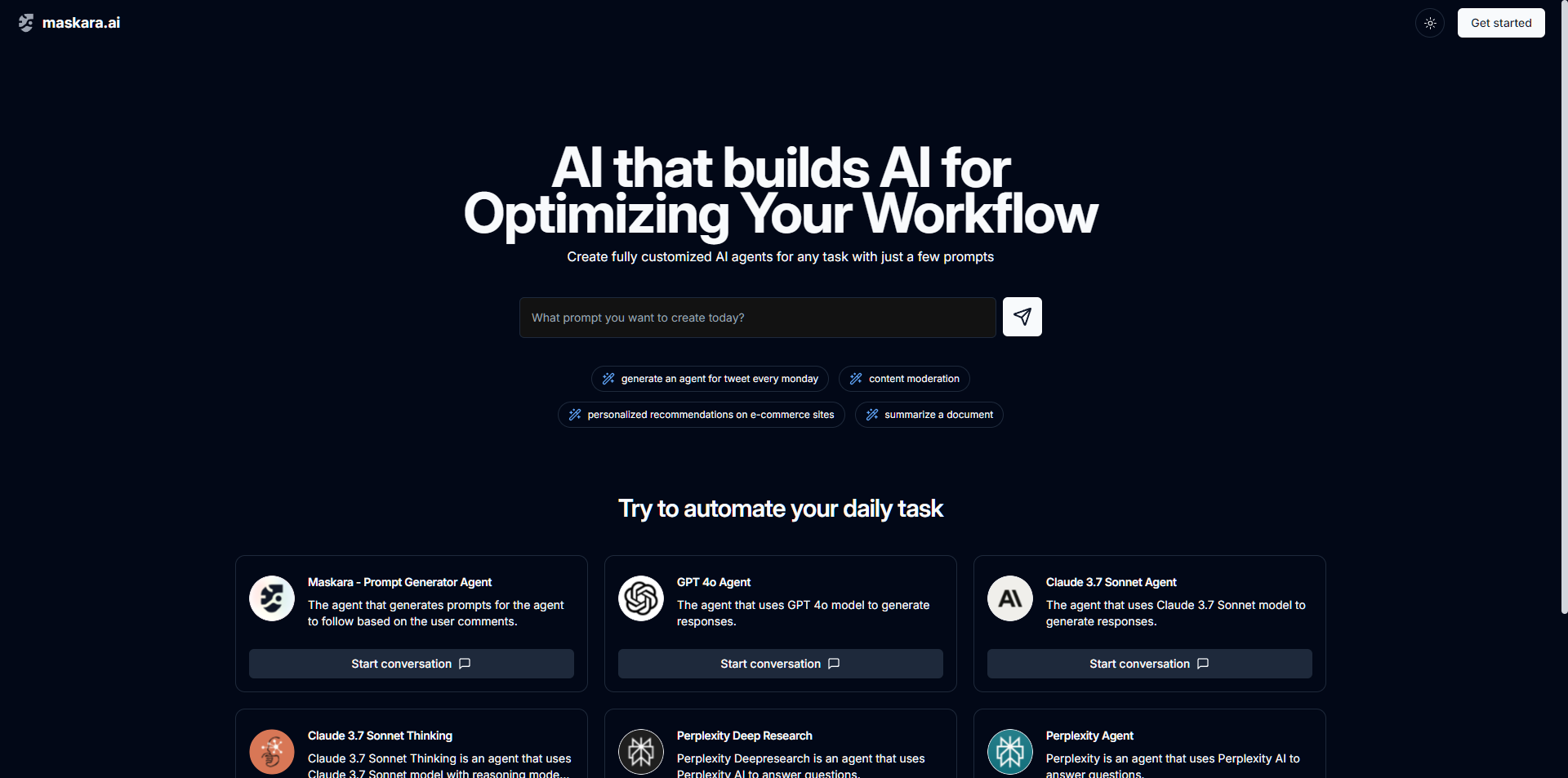 - 로그인 후 메인화면의 하단에서 Maskara - Prompt Generator Agent 라고 적혀있는 부분을 찾아서 “Start conversation”을 클릭하세요.