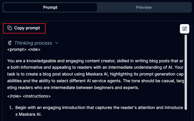 질문에 대한 답을 입력하면 아래와 같이 최종적으로 아주 자세하게 프롬프트를 출력해줍니다. 현재는 프롬프트를 영어로 출력해줍니다만, 당황하지 말고 좌측 상단의 복사 버튼(Copy prompt)을 눌러서 복사를 합니다. 그리고 원하는 AI서비스 (ChatGPT, Perplexity 등)에 가서 붙여넣은 후 맨 마지막에 "이 질문에 대한 답은 한국어로 해줘" 라는 식으로 한국어로 결과물을 출력해달라고 요청하면 됩니다.